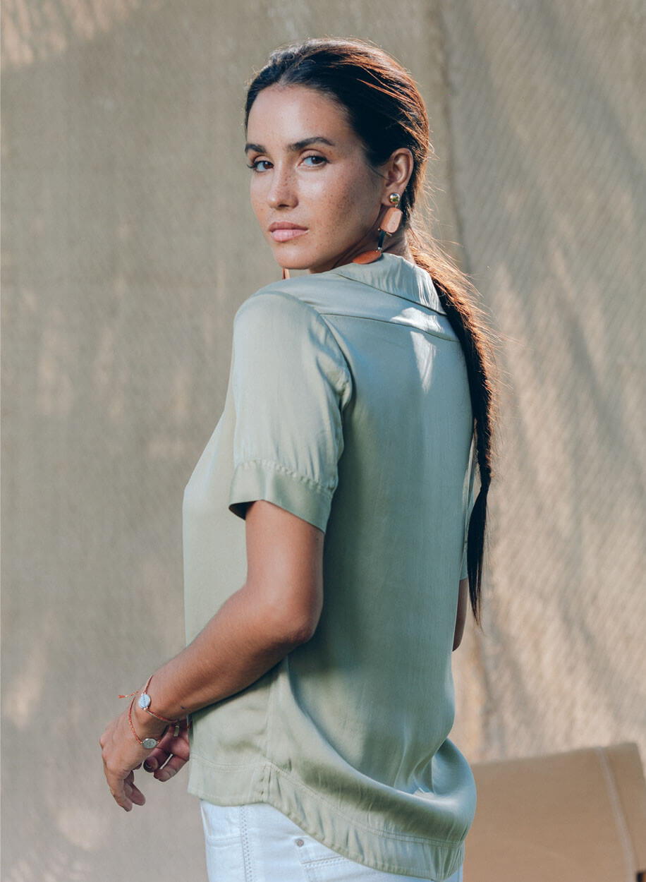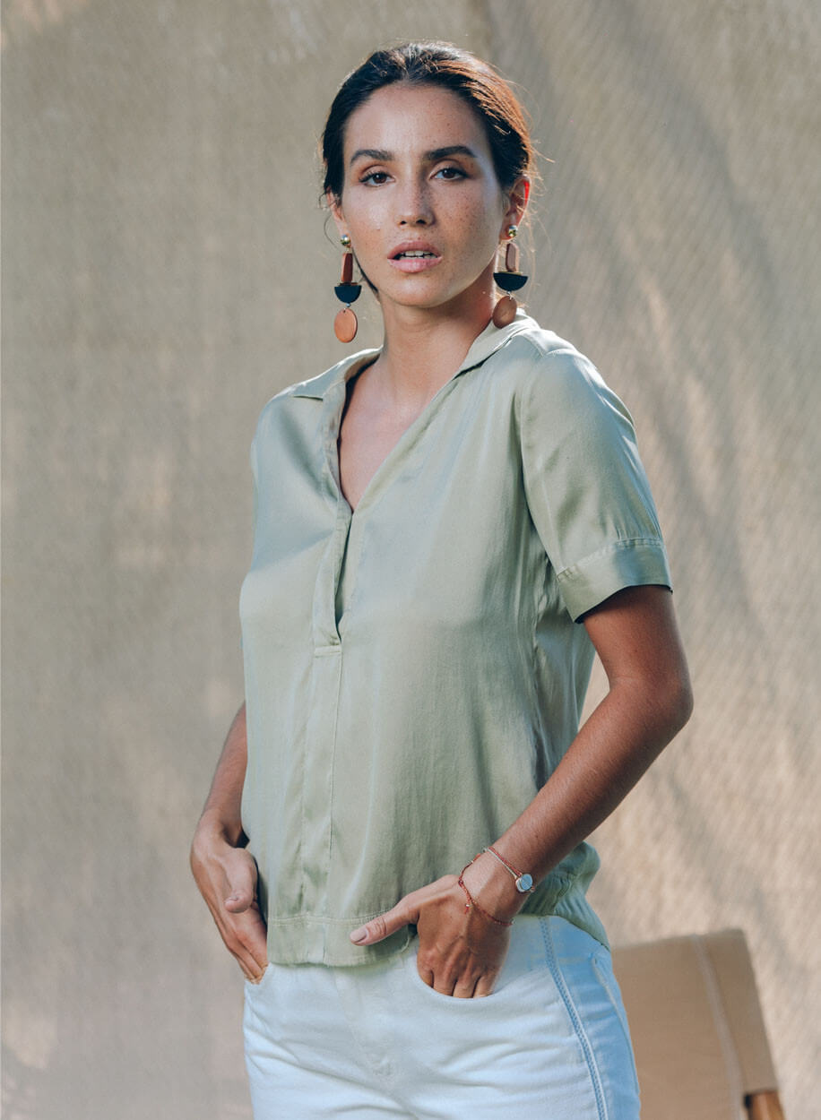 Le top PITO est composé d’un mélange de 64% de soie, de 28% de viscose et de 8% d’élasthanne.