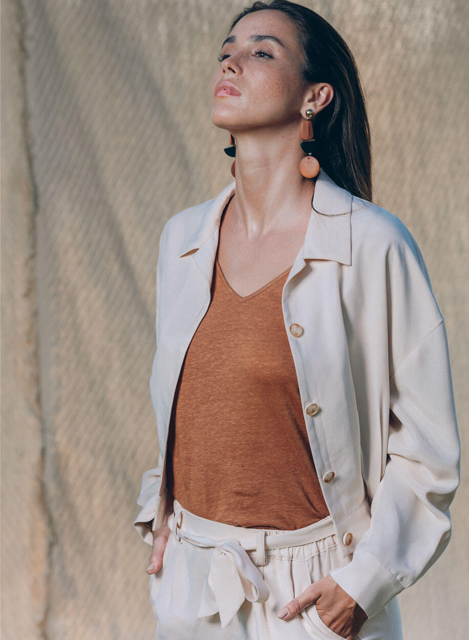 La veste ERITA est composée d’un mélange de 60% de cupro et 40% de viscose.